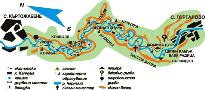 Обявена за природна забележителност от МГГП със заповед № 1422/24.06.1969 г. и горски фонд на обща площ от 300 хектара природната забележителност “Чернелка” представлява живописен карстов каньон в централната част на Дунавската равнина между селата Горталово и Къртожабене, на около 12 км от гр. Плевен. По протежение на 6,5 км малката река Чернелка е образувала феноменален каньон с ширина от 60 до 200 метра и височина на скалите от 10 до 35-40 метра.